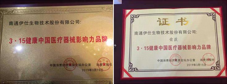 熱烈祝賀伊仕生物榮獲2019年“3?15健康中國醫(yī)療器械影響力品牌”