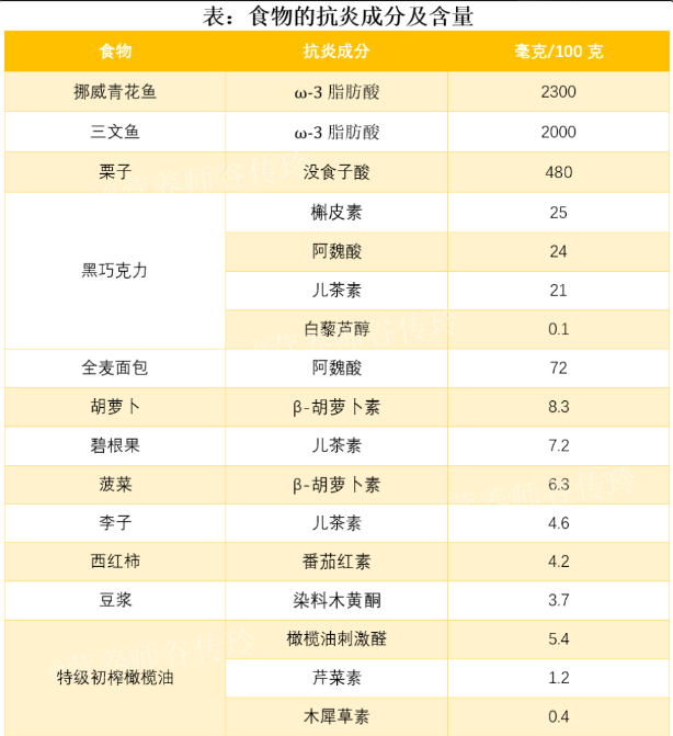 抗炎飲食可以改善體內(nèi)的炎癥因子,避免發(fā)展出疾病。比如:碳水化合物:推薦全谷物碳水化合物,比如藜麥、糙米、蕎麥、黑米等等。脂肪:多選擇單不飽和脂肪酸和多不飽和脂肪酸,比如魚蝦、貝類、亞麻籽油等含有多不飽和脂肪酸、歐米伽-3型脂肪酸。蛋白質(zhì):選優(yōu)質(zhì)蛋白質(zhì),如魚、家禽、雞蛋、瘦紅肉,以及低脂乳制品和大豆食品。蔬果:十字花科蔬菜和莓果類是最被推薦的“抗炎選手”。富含多酚、黃酮的食物:如綠茶、大豆等;香辛料:如姜黃、生姜、肉桂、肉蔻、大蒜等等在“抗炎飲食”榜上有名。⑥2023年5月國(guó)家注冊(cè)營(yíng)養(yǎng)師谷傳玲根據(jù)文獻(xiàn)研究,整理出了12種“抗炎王者食物”,供大家日常飲食中參考。